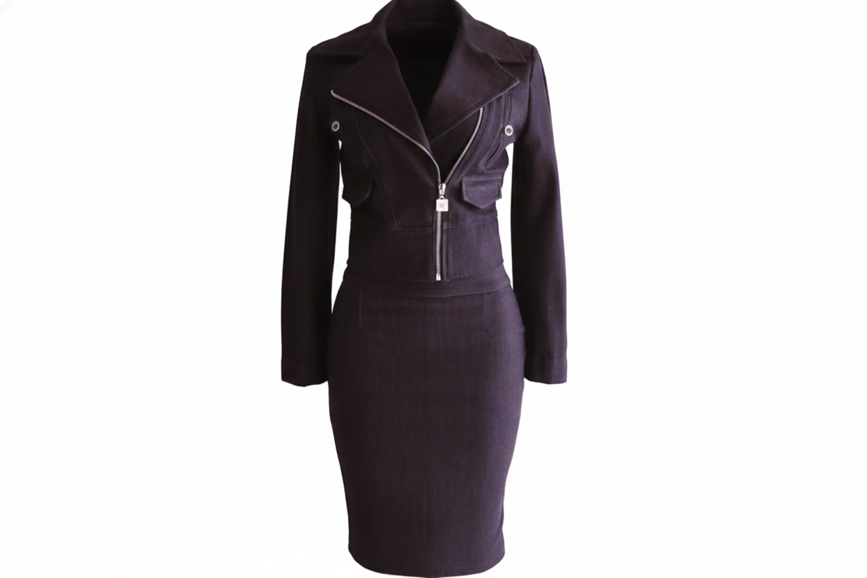 Command attention with the Élite Enforcer Denim Suit from New Power Élite Clothing. This two-piece set reimagines the classic denim suit with a sophisticated, sharp, and slightly rebellious moto-inspired edge, tailored for the woman who defines her own power.