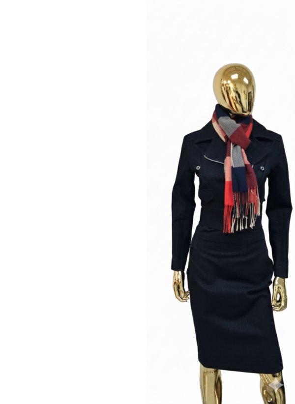 The Power Pencil Skirt: The matching skirt offers a sleek, mid-calf length pencil silhouette that is figure-flattering and sophisticated, perfectly balancing the boldness of the jacket.