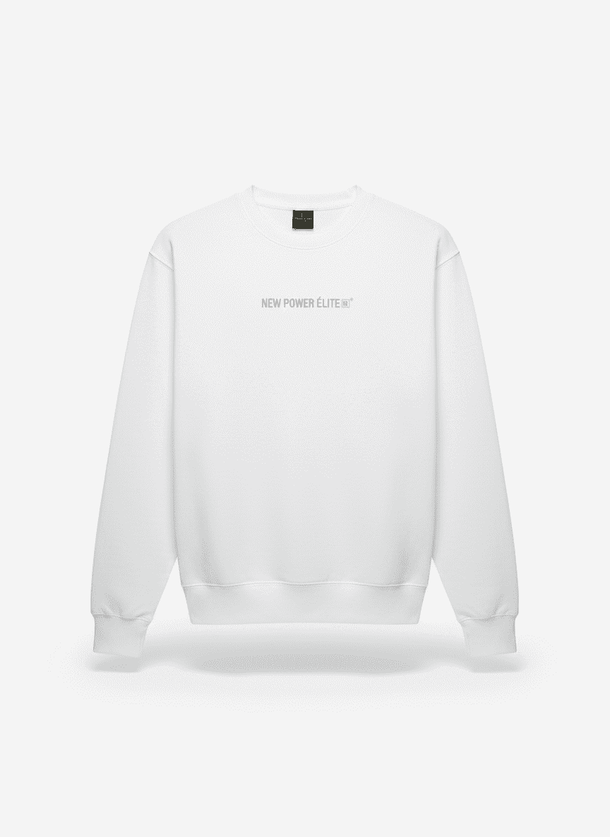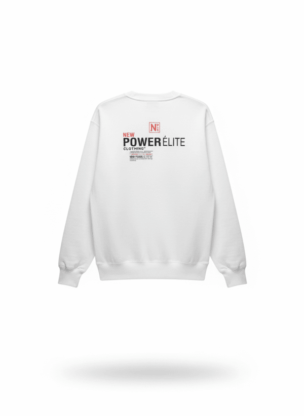 The back of this sweatshirt showcases a bold, modern graphic layout that instantly stands out. Centered across the upper back, the design features the brand’s signature mix of strong typography, clean lines, and the iconic N P É emblem in a striking red accent. The words NEW POWER ÉLITE dominate the composition with a powerful black-and-red contrast, while the supporting text below adds a refined, fashion-forward touch reminiscent of premium streetwear labels.